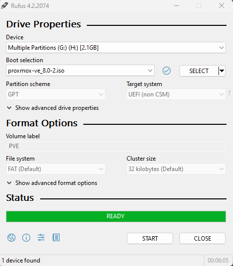 In Rufus configure the image downloaded previously and click start to update the USB drive with the necessary files.