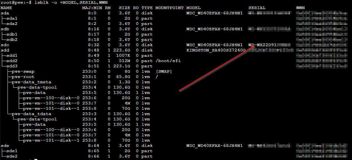 lsblk -o +MODEL,SERIAL,WWNExample results: